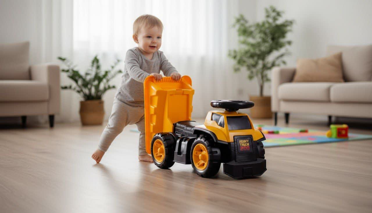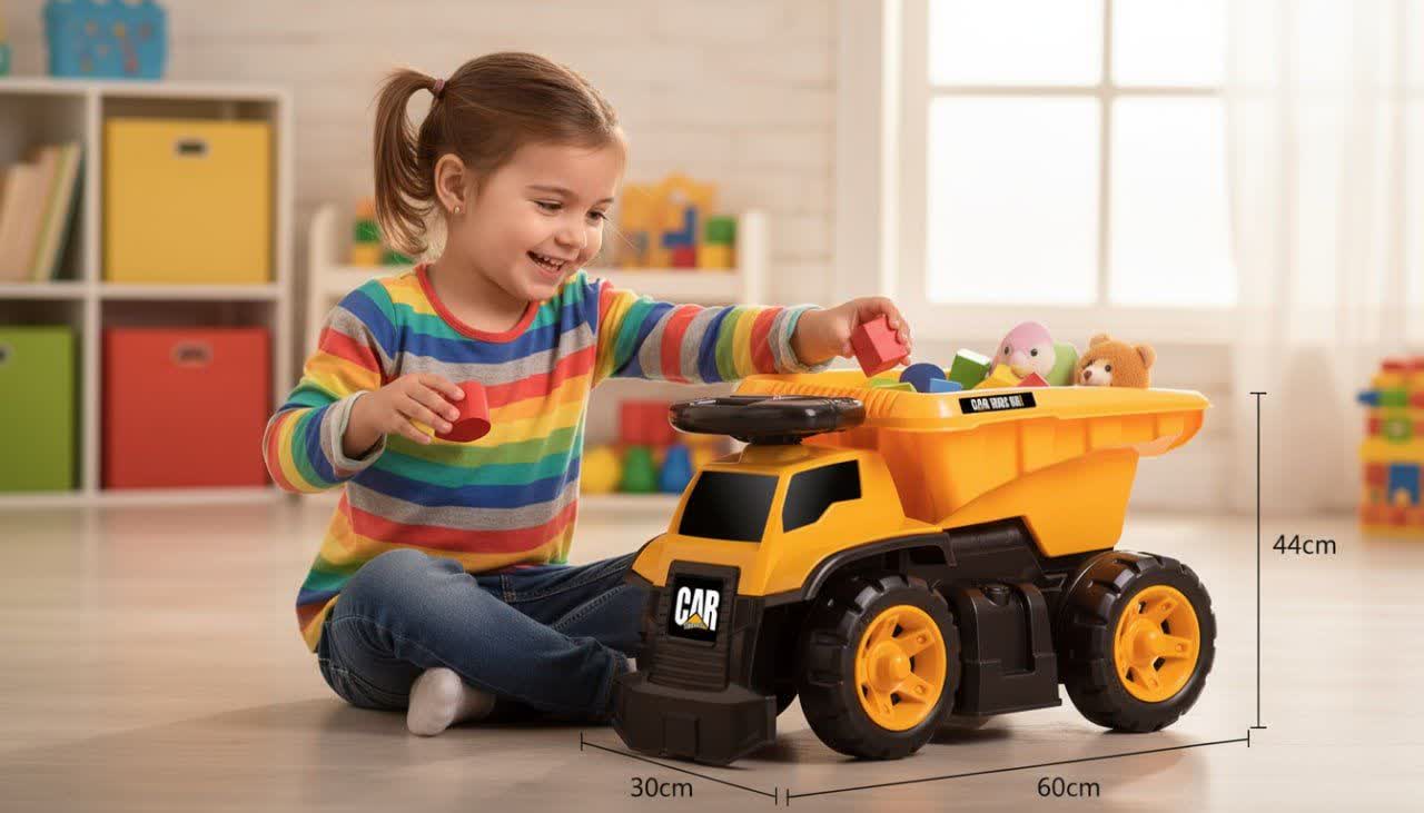 کامیون کاترپیلار را می توان سوار شد و باربند آن را بالا پایین کرد. این اسباب بازی دارای ۴ چرخ است. یک فرمان دارد که کودک می توان با سوار شدن بروی آن با فرمان هدایتش کرد. رنگ آمیزی این ماشین بسیار جذاب است. مارک برند کاترپیلار نیز بر روی بدنه ماشین نقش بسته است.