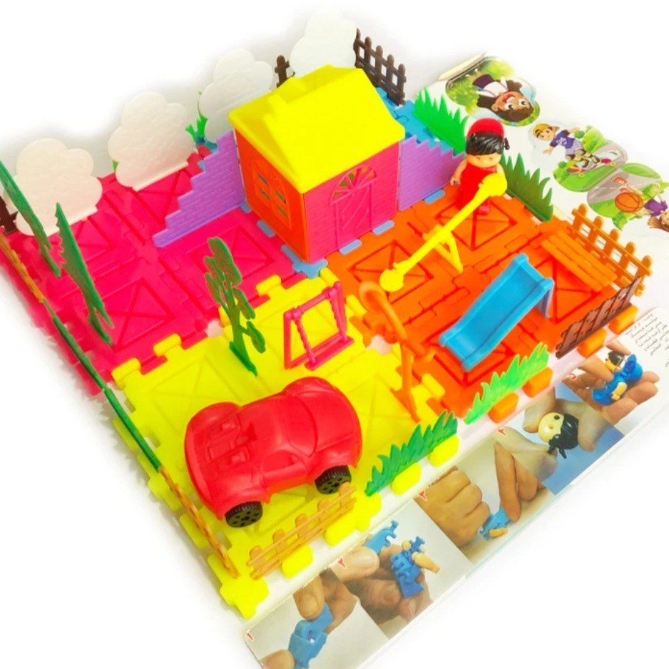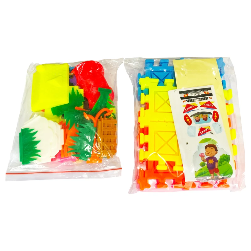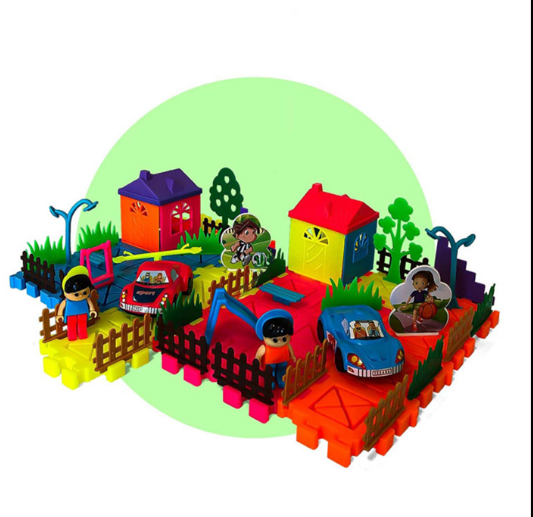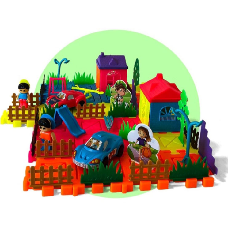 قطعات شامل ماشین ، درخت ، تاپ ، تیربرق ، سرسره ، چمن ، نرده ، آدمک ، زمین ،الکلنگ ، خانه ، پله ، برچسب ، کارت آموزش و قطعات مربوط به ساخت