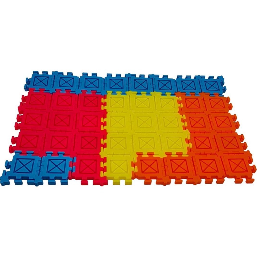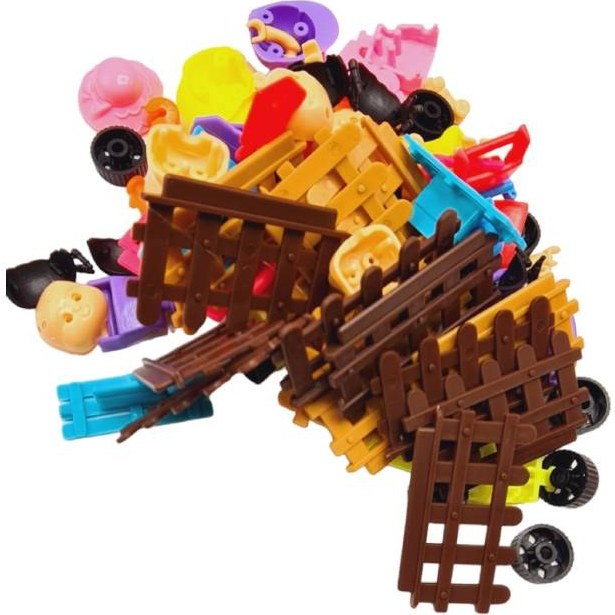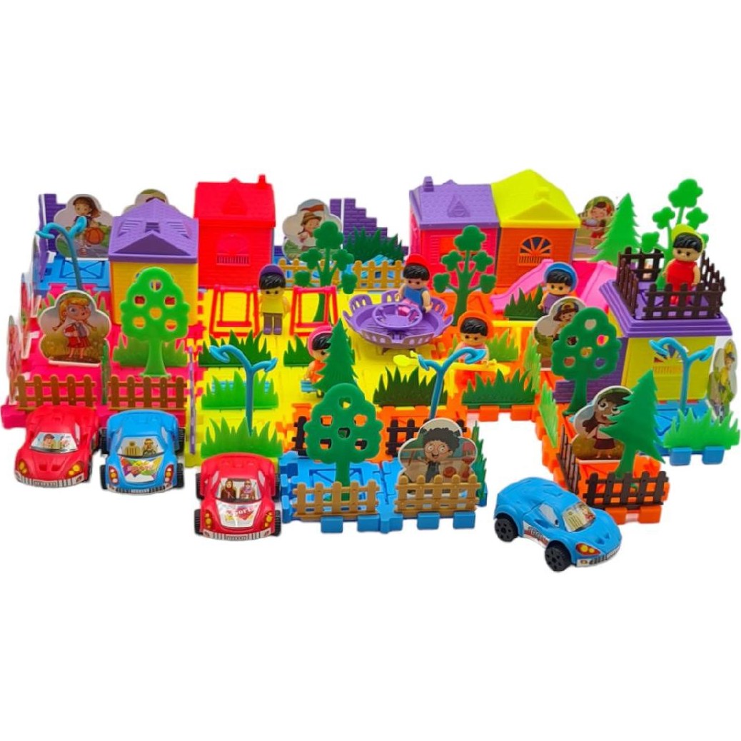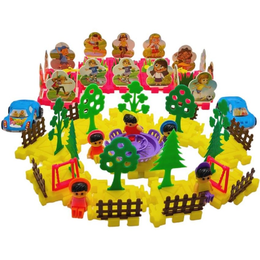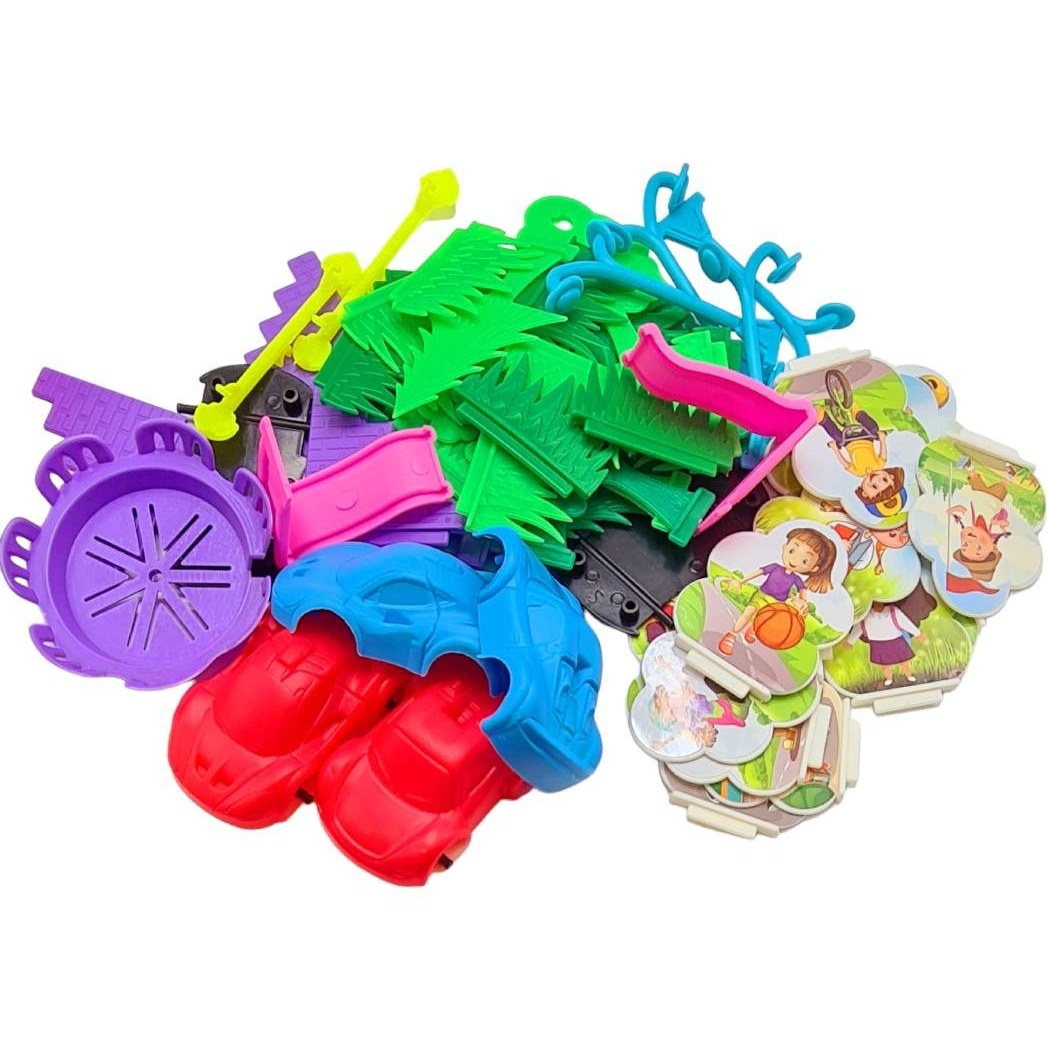 قطعات شامل ماشین ، درخت ، تاپ ، تیربرق ، سرسره ، چمن ، نرده ، آدمک ، زمین ،الکلنگ ، خانه ، پله ، برچسب ، کارت آموزش و قطعات مربوط به ساخت
