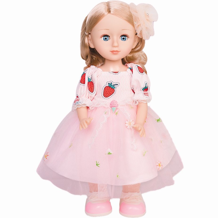 عروسک موزیکال قصه گو به شکل یک دختر بچه با لباسی سفید به همراه دامن توری و موهای بلند طلایی است و دارای چشمانی آبی می باشد که با تغییر حالت عروسک چشمها باز و بسته می شوند.